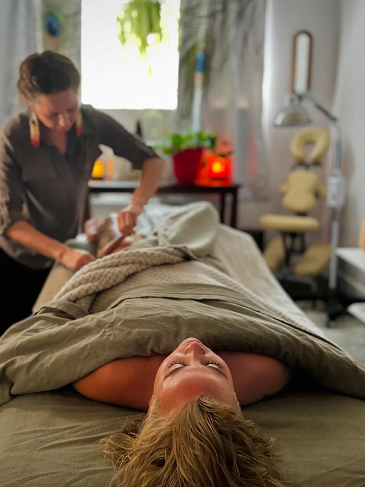 Gua Sha – Traditional scraping technique using bone, crystal, or stainless steel tools to release scar tissue, stagnant blood, inflammation, and deep muscular tension.